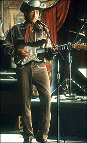 "I'm here tonight, really, to support him," she tells me as she glances supportively at the figure anxiously replacing a string in mid-verse. "Of course, I know only too well how much it takes to step out on that stage with only a song between You and," as her hand sweeps over the dance floor, "them. It's a rough game. No, wait a minute: it isn't a game... It's a way of life, isn't it? It is life for them, isn't it? All these singers; all these kids. All their songs. But what can it really all add up to? In the end , I mean?" Strange to hear Bob Dylan's ex-wife unloading baggage onto a stranger like me -- and in Hoboken. But then, one doesn't get to be Bob Dylan's ex by keeping one's thoughts to oneself, I should imagine. "You'll excuse me now, won't you?" she smiles as a final chord fades from the speakers under-foot. "I must get Peter out of his wet shirt and into a dry cab." Bob Dylan's ex-wife pops to her feet and, with a somehow sincere "Take care!" flung at me over a shoulder, rushes around the nearest corner out of view. * * * * * * * * * Bob Dylan's girlfriend called me at 11:30 one night. She wondered if I could possibly make it over later to help her arrange some songs. "I have a show Monday, and I'm absolutely frantic," she bleets. "It'll only take an hour or so. I promise." Ten minutes later I'm deposited outside her building on one of the Upper East Side's most uppity blocks. I look up to see her already waving crazily through her Pella windows. A second later, she's dashed downstairs to haul me in. "I'm sorry, I'm really sorry, but the intercom's on the blink and we're between doormen. And during this of all weeks! I'm really terribly sorry, but you know what they say about if it's not one thing it's another..." I'm scrambling to keep apace as she whisks me through the lobby and up the stairs to her majestic double oak doors. Bob Dylan's girlfriend's apartment is huge and sumptuous in the extreme, despite the fact its lone contents at the moment are a futon, a piano, and a fireplace full of orchids. "I'm sorry there's nowhere to sit yet -- there's hardly anything to eat yet -- but I've only just moved in three nights ago and my furniture's still somewhere between here and the coast. At least I hope it is! With the kind of week I've been having, I'll bet the trucks have broken down somewhere in the wilds of Minnesota and I'll be living on Ritz Bits for the rest of my life!" As I glance overhead at the ornate chandelier and, higher still, clumps of Renaissance angels painstakingly painted over the ceilings, I can't help but realize a goodly percentage of Grand Central Station's homeless could most comfortably spend their remaining days in Bob Dylan's girlfriend's closet. "Okay, okay. I have half an hour, maybe forty-five minutes, to do on Monday night, and between the fittings and the pre-shoot -- what am I going to do about this hair! -- I have to whittle down the absolute best set of songs I can before I can hire all the back-up people. Now, I think it's important above all else to showcase the width, the depth of my repertoire: after all, we're no spring chickens here! I mean, I've been working that Village since I was fourteen! I met Bob in '65, you know. What a little twerp he was then. You know, sometimes I still call him my little twerp! Anyways, I met him in one of those awful dessert places on Bleecker and Bobby was, how shall I put this... SHIT-FACED. He was drunk, okay? And he was hitting on me for God's sake. Hitting on me! And I just kept saying to him, "Get away from me you little twerp" -- that's what I used to call him -- but he could not leave me alone! All night he's going "You're beautiful. What's your name?" Hitting on me, right? And I was so young and so scared I just wanted to get OUT OF THERE. But Bobby said -- and I'll never forget this -- Bobby said "That's okay. That's okay. We're gonna meet together again someday. Out on the coast". And dammit, nine years later -- and just about as many husbands! -- I'm out in L.A. searching everywhere for the man, and would you believe it? We got together. We meet again. Just like he said we would! He even let me sit on the couch for that "After The Flood" [sic] tour. Would you believe it? And you know what? He's just as big a little twerp today as he ever was!" By 4 A.M. I was getting hungry and even a little bit tired. Not that I don't mind listening to Dylanspeak upon Dylanspeak direct from the girlfriend's mouth as it were... "I'm awfully sorry, but I don't want to keep you here all night, but would you believe I don't even have a clock here? With my luck, I've left it out on the coast... not that you ever need to know the time out there! But thank you so very much for coming by so late. And at such small notice too! You know I appreciate it much. But I'm sorry, but I've got these damn fittings and that damn cheek thing of mine all day tomorrow, and God, will I ever get everything banged together by Monday night?" Bob Dylan's girlfriend saw me into another cab and, you know, we never did get to work on any songs.
