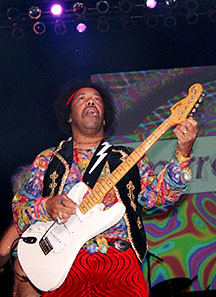 E.C.: I found the website with your original songs. Do you eventually want to promote your original material? Byron: I don't know man; I'm beyond all that. If it happens it happens. If it don't, I'll just play guitar. That's what I did before anyway, I didn't do it to write songs. E.C.: Tonight you hit those solos dead-on. How did you first know you had the knack to do a Hendrix show? Byron: I connected with Jimi when I was just a little kid. Just years of playing the songs over and over and over…it developed into that. E.C.: I read on your website how as a kid you would collect soda bottles to buy Hendrix albums… Byron: Sure did, all day. I couldn't even afford a guitar then. I finally got a guitar, learned how to play eventually. And practiced for hours and hours and hours. E.C.: So, did you have an affinity for Jimi's music? I mean, there was so much going on music-wise then. Byron: I mean, I like it all but Jimi to me was the top. E.C.: When it comes to movies or TV that want to portray Jimi, have you ever been approached by any of these projects that were looking for someone to play Hendrix in their films? Byron: Oh no. E.C.: How do you get into the role? Do you study the old films? Byron: I used to… Larry [manager]: What you've got to understand is that Byron has been playing guitar since he was eight years old. When you asked if he's been approached? We've had a couple of offers, but they've always been diffused by the actual Hendrix foundation. It used to be run by Jamie, his stepsister and she decided to turn it over to the family. So now the bank runs it. When she was running it, she had a tendency to be..I would say…to put it mildly… Byron: A bitch? [laughs] Larry [manager]: …a little greedy and a little preachy. Remember the show, "You're Big Break"? Well, we auditioned and everything was a 'go' - but Jamie wanted too much money to air it on national TV. We were also approached by a movie, and that was shut down by the same thing. So, it's really hard to be a Jimi Hendrix. E.C.: With the current Jimi Hendrix estate? Larry [manager]: It's because the world is greedy. When Jimi's father was running the estate, it was fine. And as soon as he died Jamie would take every old tape that he ever did and make a CD out of it to make money. She did really good for the estate, but she did it too well and really didn't cover her bases. And then the brother wanted a piece and said that he was stated in the will. He went to court and the court found out that the will was good that Jimi's father made and Jamie finally got sick and tired of the whole mess and turned it over to the family. E.C.: Well, didn't Jimi state that he DIDN'T want to be buried in Seattle and they did it anyway? Byron: He didn't want to go back there dead OR alive. E.C.: How long have you been doing this? Byron: Jimi? I've been doing Jimi all my life. And constantly…steadily for the last three or four years.