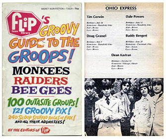 "Flip's Groovy Guide To The Groops" by the editors of Flip Flip was a teen magazine popular in the late 1960’s. This 1968 paperback by the editors of Flip, is laid out in an encyclopedia-like format. It lists the majority of all major-label bands that were current at the time with a black and white picture of each one. It lists each member of the group, their hometown and birth date. A brief history of the group is given. A lot of information though leans towards group member’s fave colors or tastes in girls. This book spawned a sequel: “Flip’s Groovy Guide To The Groops 1969-70.”