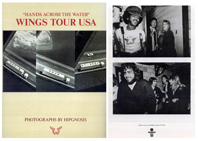 “Hands Across The Water” Wings Tour USA This 1978 soft cover book was put together by Hipgnosis, the legendary team who designed iconic LP covers for Led Zeppelin, 10cc, Pink Floyd, and of course Wings. The photos are by Aubrey Powell. The book is a collection of black and white images taken during Wings’ blockbuster 1976 “Wings Over America” tour. Among the pictures are shots of people they encountered, cityscapes, fans, street vendors, roadies, policemen, hotel rooms, airplanes, dressing rooms, and of course many shots of the band traveling, rehearsing, and playing. The bottom of each page tells the city and date of each shot. It is like looking through Paul and Linda McCartney’s own scrapbook of the tour. A very enjoyable book and a must for Wings fans.