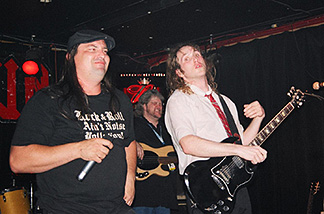 E.C.: How do you balance the AC/DC songs that you play live? Is it a 50/50 split between the Bon Scott-era AC/DC and the Brian Johnston-era AC/DC? Andy: Yeah, we try to…it just depends on the night. E.C.: When singing, do you try and differentiate your voice between the Bon/Brian songs? Andy: You have to think about that too when you are setting up the set list. You can’t jump back and forth, back and forth between those two singers. E.C.: When I saw AC/DC on the FOR THOSE ABOUT TO ROCK tour, they used cannons. Any pyrotechnics in your show? Or cannons? Andy: We carry the most complete AC/DC show of any tribute that I have seen. Tonight we could not bring in all of our props. We have a complete Marshall stack back line. We have 2 Bells 2 1/2' x 2 1/2 ' for the small places (not enough ceiling height in there) and a 4' x 4' bell for outdoor events. They are identical to AC/DC's bell. We have 2 sets of cannons, of course the money blowers, And the only Rosie doll that I have seen. (The Peachtree Tavern didn't want us to use her) And I think you saw the set list, we have over 55 songs and counting. E.C.: When it comes to audience response do you have any fans that treat you like the actual AC/DC band? Andy: Oh yeah, it happens a lot. They want the t-shirts, they want autographs. E.C.: Is there any groupie action, such as "Whole Lotta Rosie" stuff goin on? Andy: (laughs) Lee [drummer] is the only single one in the band! E.C.: Any final words? Andy: Thanks for the interview, and remember that all tributes have a lot of people behind