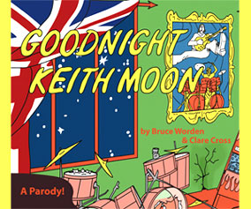 Two things I LOVE are parody and rock & roll, so of course I couldn't wait to get a copy of "Goodnight Keith Moon: A Parody!" The book is a parody of the bestselling bedtime story children's book, "Goodnight Moon" (which was originally published in 1947). In the original story, a bunny getting ready for bed says goodnight to everything in the room: a balloon, a dollhouse, kittens, a young mouse, a painting of the cow jumping over the moon, etc. And as the story progresses, the room slowly gets darker as the clock changes time. In "Goodnight Keith Moon: A Parody!” not only do the illustrations mimic the original, but the rhyme scheme does as well. But the difference is: now the room is filled with Keith Moon references and it takes place in the room where Keith died in 1978! So you have a painting of Pete Townsend jumping over the Moon, a pinball machine, a magic bus, a picture of "Who's Next", and of course the obligatory empty alcohol bottles and pills (Hey, this IS Keith Moon we are talking about!). It is fun to spot the Keith Moon references around the room: the "not to be taken away" chair from "Who Are You"; the ghost of Mama Cass (who died in the exact same flat in 1974); "Animal" from the Muppets (whose character was based on Keith Moon!); a drum tom filled with fish (Keith played just such a tom on a television appearance). And there are many album covers lying on the floor: "Let It Bleed", "Rubber Soul", "T-Rex", "Blonde On Blonde", "A Hard Days Night", "Nashville Skyline", etc. (What?! No Beach Boys? They were Keith's favorites!). All in all, "Goodnight Keith Moon: A Parody!" is a devilishly clever parody (while maybe not appropriate to read to all children, ha ha). Rock & roll fans familiar with the original book will find it a hilarious read! I hope that Bruce Worden and Clare Cross continue to do such parodies because the possibilities are endless.