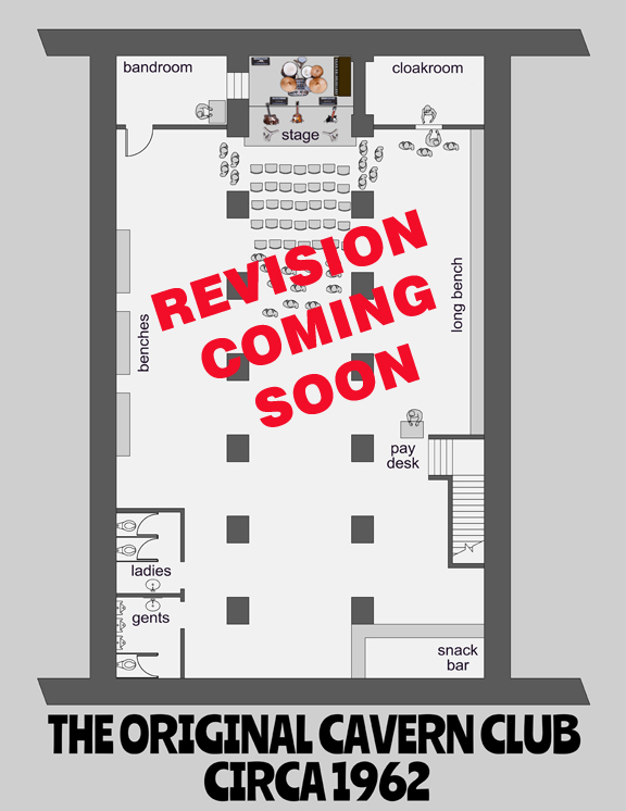 "To give you a clearer picture. The plan you have of the Cavern proper was before we renovated the building in 1966. Because there were no main drains in the Cavern, just a cess pit under the toilets, Liverpool Corporation insisted that a new drainage system was put in place. We built new toilets at No 8 Mathew Street on the ground floor with a new drainage system which were connected to the main drains and the existing toilets in the Cavern proper were removed together with the snack bar. The Mersey Bar (No 12, Mathew Street) to the left of the Cavern proper was bricked up until 1969 when we needed more space and opened it up and made it into a bar and restaurant. The store room and artist room on your plan at the far end never existed. Neither did the store room and toilets at the front end of your plan. There was a small kitchen situated halfway down the right hand side of The Mersey Bar. The central block where the kitchen is situated on your plan didn't exist. The main square bar was situated at the back of the Cavern proper, accessed on four sides. Two steps led down to the left into the Mersey Bar. You are right about the stage looking larger than it was; it was smaller than your plan and only protruded as far as the end of the first arches. Mathew Street slopes down from North John Street, hence the different levels of 8, 10 and 12 Mathew Street."