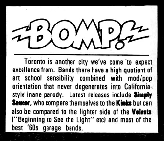 Kevin Christoff: But, we got some good reviews over the single. We got some positive press on that. Some people maybe didn't like it, but you get that, right? Stephen Park: There was something in Record Mirror that compared us with the Who and we just were floored. We couldn't believe it! But that was somewhere in England, and it just seemed so inaccessible. We didn't seem to be able to capitalize on some of the interest that the single was generating. GPG: Cub Koda - remember "Smokin' In The Boy's Room" by Brownsville Station? - he loved Saucer. He gave "She's a Dog" an amazing review in Goldmine, about how all the "dog, dog, dog"s in the chorus were driving his wife crazy. But how to make best of all this press that was coming in from literally all over the world? I was just one guy, with a bunch of Sharpie pens and cardboard mailers, working out of the basement. Tom Williams: But most people were like one- and two-men operations. They didn't have the distribution, they didn't have the know-how, there was no support system in terms of national radio, national television; newspapers tended to ignore the local acts, there were no consumer music magazines that meant anything - a couple of trade publications that didn't mean a lot. It was kind of a baby industry, really. I mean, it really was a bunch of people playing Let's Make Records! I think we were pretty naive and we said "We can do this," and if we'd actually known what the stumbling blocks were we probably wouldn't have. But we did, and I think that's always the way. Because when you're young, you can do anything. In theory.