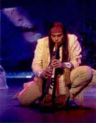 The four band members slowly entered covered in blankets, sitting on the stage with their backs to the crowd. Robert Mirabal entered, touching each one whom then rose and took their instruments. The show began with “Painted Caves”. Robert then told a story of the ancestors. He introduced the next song, “Little Indians”, by telling the statistic of suicide rates among Native Americans. The next song, “Ee-You-Oo” (little boy) was introduced as a ‘song for the children’. Robert then told the humorous ‘blowing tube’ story, talking about the magical powers of flutes told to him by his grandmother. Although he had been told of the enchanting, magical power of the flute over maidens, he pointed out at a friend of his has 15 flutes and is still single! The “Courtship Song” followed, with a captivating dance performed during the song. Robert made a tongue-in-cheek social commentary about how he used to see movies on the reservation, where he “finally got to see a REAL Indian on the screen coming out of their teepees in the desert”! Some people in the audience didn’t get it (Teepees having a totally Hollywood created association with Indians) and he repeated the joke. “Medicine Man”, from the excellent MIRABAL CD followed.