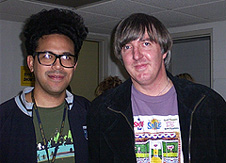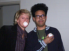 Thus began our “backstage Chastain adventure” as Margaret, French and I decided to go backstage before the show. The “security” staff at Chastain consists of what is possibly the most anal backstage staff in the history of rock! The first thing I notice as we pass by all the instruments that are lined up is the myriad of yellow tape placed on the floor, complete with instructions (no entry past this point, guests only here, etc ad nauseum). Lots of beefy, bouncer looking half-wits that probably outnumber the “guests” 10 to 1. Hell, I was even scared to ask where the bathroom was, lest it be in a “restricted” area! We were finally told to wait in the catering room, while someone went to get Jeff Foskett. A few minutes later Jeff comes in saying hello to Margaret. The first thing I noticed is the amount of weight he has lost – especially since the “Beautiful Dreamer” documentary. Margaret gives Jeff her batch of SMiLE buttons for the band and shows him her photos. Then she introduces French and me to Jeff. After shaking my hand, Jeff immediately says, “you look like N.D. Smart! Doesn’t he Margaret?” [N.D. Smart was the drummer for the ‘60s band THE REMAINS and later played with Gram Parson’s touring band] Jeff then decides that he wants to play a joke on Darian Sahanaja. He tells me to just play along and pretend I’m N.D. Smart. We follow Jeff out of the catering room towards the hallway leading to the dressing room, where we are stopped by the über-guards (despite the fact that our passes say, ALL ACCESS). Jeff explains to them, “These are my guests and they are coming with me” – and the dragoons finally relent. As we are walking down the hall, who should be coming the other way but Brian Wilson himself (with two assistants)! With my camera (and items to autograph) still in my backpack, I only had time to shake his hand and introduce myself. He seemed to have a funny look on his face – maybe it was my “unofficial” SMiLE t-shirt? What immediately struck me about Brian was his height – he seemed to tower over me and I’m 6 ft tall. It was only a brief encounter and Brian was gone as soon as we introduced ourselves. We then walk into the ‘lounge’ area of the dressing room, where Scott Bennett & Darian Sahanaja are relaxing. Darian is busy at a little laptop computer and Margaret jokes, “Is THAT the one?” [Refering to the computer that Darian uses in “Beautiful Dreamer” to sequence SMiLE with Brian] Darian quickly responds, “No” and I jokingly add, “I suppose the original is now in the ‘Wilsonian Institute’” . Jeff introduces me to Darian as N.D. Smart and Darian FREAKS, saying “Really? Wow! No Way”, etc. He even does the WAYNE’S WORLD “we are not worthy” bit on his knees. Scott then comments about my SMiLE t-shirt asking where I got it and saying it is really cool. While I am talking to Darian and Scott, Margaret gets some photos, as well as some photos of Taylor Mills, who had just entered the room. At this point Darian asks me what “N.D.” stands for and I start to panic because I have NO idea! Luckily, Jeff Foskett comes to the rescue and states the answer (I was so panicked that I couldn’t remember what the answer was!). I then ask Darian if I could get an autograph and he freaks again saying, “I can’t believe this! I used to play all your stuff!” I pull out my tour programs and my WONDERMINTS CD and a sharpie pen and he asks to personalize it! I stammer just a bit, thinking, “I don’t want my stuff autographed to N.D. Smart” and just tell him, “just a signature”. While he is signing, I ask him about the “Beautiful Dreamer” documentary – and he admits he still hasn’t seen it. I then ask him about the DUMB ANGEL FAIRY TALE and his little “intro” piece to the film. “You saw that?” he exclaims – but before we could talk more about it Jeff suddenly tells us, “gotta go”. I get one quick picture with Darian and we are bound down the hall, again bumping into Brian. Margaret asks Brian for a picture and he poses quickly. I guess this was my one chance for a photo, but Jeff was pressing us to leave. As we are walking down the hallway, Margaret asks Jeff if we can eat (the band has already eaten, so it was not like we were taking food out of their mouths). He said, “Sure” and we enter the catering area again. We get our plates, food, sit down and start eating – just then Jeff comes back and says, “I wasn’t supposed to let you, so eat quickly!” So there we are, wolfing down the catered food before the über-guards eject us from the holy premises. Back in the main arena again, it has already gotten dark and we start to find our seats. I spot Jez Graham [new writer for EAR CANDY and fellow SMiLE enthusiast] who hands me some of his CD’s [Brian Wilson tribute CD on piano] to give Darian when I got backstage after the show.