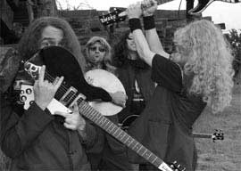 Sure we put on a rock show but we really try to be true to what our characters have become. We don't do James Hetfield, we do Jaymz Lennfield--a big difference. We realize there is a bit of bombast and almost cartoon humor that goes into this. To display that while we bash heads is a totally good time! We have a tradition now where we invite folks up to sing the end of "Hey Dude" with us. One of these times, the stage is gonna go, we just know it... E.C.: What's the strangest show you've ever played... Beatallica: Man, when doing a solo show once (this is Jaymz talking) in Kalamazoo, I spent the night at the club owner's place. He owned the undertakers house in the middle of the cemetery. And let's just say he had very active roommates. I do believe they were undead, as well. Beatallica just did a Halloween show at our bud's place. He lives in a funeral home here in Milwaukee. No lie, the embalming room is still intact. It was on Kliff's birthday just recently.