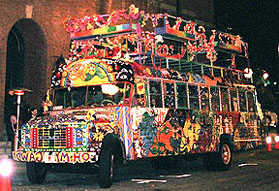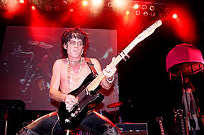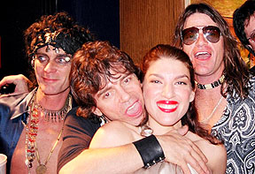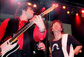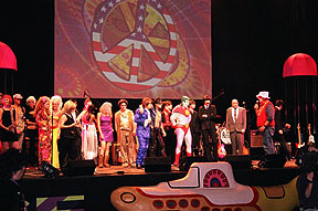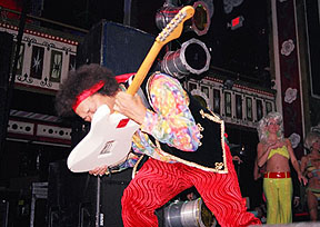 When I arrived outside the Tabernacle, the doors had not yet opened, so I waited and people-watched as the guests arrived. The first hour was a VIP party with a celebrity meet-and-greet. Jane Fonda was one of the celebrity guests and I was hoping to get my photograph of Barbarella signed by her. The crowd outside was a 50/50 split between almost formal wear and '60s-themed costumes. This was probably one of the few times other than Halloween that you would see grown men in wigs! Parked outside the venue was a large psychedelic bus, which really set the mood for the evening's event (The owner of the psychedelic bus is Sue LeCraw Dunn, who was the 2003 X-mas Party Co-Chair). Once inside I just wandered around, soaking in all the cool decorations. There was a giant yellow submarine in front of the stage, with various "Yellow Submarine" movie motifs around, such as the blue flying glove. Assembled on the stage were all the bands for the evening, in full costume, along with 'Ed Sullivan', 'Captain Planet', 'Austin Powers', and assorted go-go dancers. After a few announcements, this crew left the stage to mingle with the growing crowd. At this time I saw 'Jimi Hendrix' (Byron Bordeaux) and introduced myself as being from EAR CANDY and we agreed to sit down for an interview at some point in the evening. I grabbed a drink at the bar and as I turned around, there were The Beatles (The Return) talking with 'Ed Sullivan'. Very surreal! 'Ed Sullivan' is actually Jerry Hoban - straight from Las Vegas as Ed Sullivan from the hit movie "Pulp Fiction". As I was talking to him, I found it that I had seen him live before, when I saw the Fab Four in Vegas in 2001 at the Las Vegas Hilton. I was dying for a cigarette, but I didn't notice anybody smoking. I politely asked a girl that was tending bar if you could smoke in The Tabernacle (I had been to enough rock shows there where there WAS smoking, but I didn't want to commit any fauxpaux at such a ritzy event) and she angrily shot back, "NO!". I got the same reply when I asked if there was a smoking section. At precisely this time, I noticed 'Mick' and 'Keith' from the Rolling Stones tribute band Sticky Fingers. After introductions, I asked 'Keith', "If there is anybody in this joint that would know where I could smoke a cig, it would be Keith!" He laughed and said, "Follow me". The last time I had been backstage at The Tabernacle was when I interviewed Lemmy, and as we walked the hallway to the dressing room, I told 'Keith' the story of how Lemmy tore down some offending artwork off the wall of that corridor. And yes, the hallway was still adorned with hoaky art! Sticky Fingers was assigned the same dressing room that Lemmy had when I interviewed him and it still looked the same, with the same leather sofa and coffee table. We sat down and started to chat about all thing Rolling Stones. Soon, the rest of the band filtered back to the dressing room and we commenced with the Sticky Fingers interview. Unfortunately, by interviewing the band, I missed my opportunity to get my Jane Fonda autograph, but that's show biz! Also, The Return had started their set.