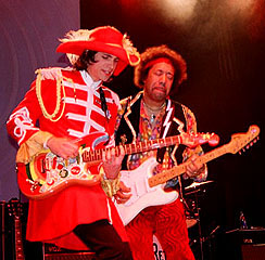 We wrapped up the interview and I went back into the main crowd, where I caught the end of The Return's set. Since I had brought plenty of film, I started to get a few crowd photos. There was even a man on stilts walking around the crowd - It was almost reminiscent of the "Rolling Stones Rock & Roll Circus" from 1968, the only thing missing being the midgets and fire-eaters! The lines to get something to eat were about an hour long, so I passed, not wanting to miss any of the bands play. There was a special video-recorded appearance by Peter Max who was presenting Ted Turner with a special gift. The gift was 4 Andy Warhol-type portraits of Turner, one of which he was to keep and the others were to be auctioned off later in the evening. Turner appeared on stage to pick his choice of portraits and say a few words. Now it was time for Jimi!