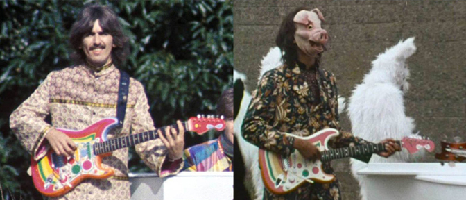 The guitar that Stig plays in the "Piggy In the Middle" video is NOT George Harrison's Rocky guitar, but a re-creation. I had always thought that since George was involved in the film that he lent his "Rocky" for the Tragical History Tour scene. But upon closer inspection, while Stig's guitar is close, there are some differences and it has elements missing. It just shows the little details that make this movie so special - to have a guitar re-created for just one scene. I wonder where that guitar is now?