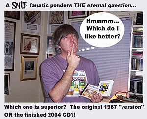 To me a re-recorded SMiLE makes more sense that fiddling with the original tapes. We've recently seen what happens when you "fuck with the formula" (to use a Mike Love-ism) and bastardize old tapes: the fiasco that is LET IT BE NAKED. LIBN was both an insult to the established fans and an outright lie to new fans who think they are getting the "real deal". I for one am glad that Brian has released a new recording SMiLE and not simply releasing a live album. To me it will bring closure & finality to the SMiLE saga. Brian realizes that it is not 1967 anymore - too bad some folks can't (or won't) grasp that fact.