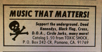 ![]() Toxic Shock (later rebranded "Toxic Ranch") specialized in selling independent punk records at a time when many of these records were hard to find. If were you were looking for records from the likes of Conflict, Rudimentary Peni, and Flux of Pink Indians, and didn’t have a good record store near where you lived, Toxic Shock was the most reliable retailer available (back then even a 'good' record store didn’t necessarily carry a large selection of punk rock) Punk rock in the 1980's was not the money-making proposition it is today (e.g., Epitaph records, Fat Wreck Records...). Even when records were moving briskly, Toxic Shock often had trouble making the rent.